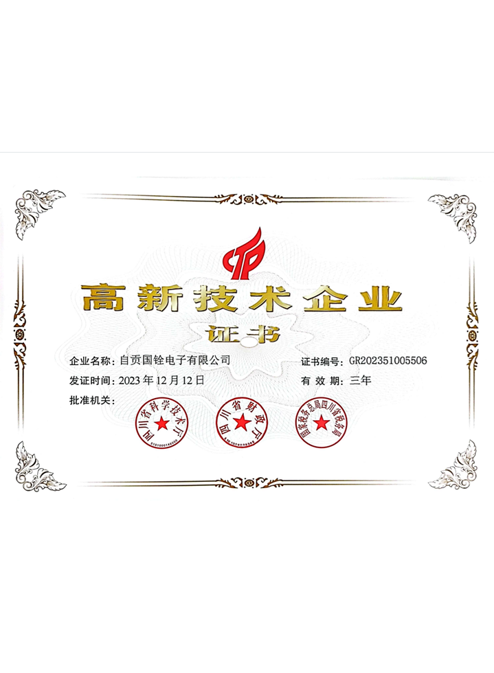 自貢國銓電子有限公司坐落于有著千年鹽都,南國燈城,恐龍之鄉(xiāng)之美譽的四川省自貢市沿灘自貢綜合保稅區(qū),距成都,重慶,樂山,內江,宜賓,瀘州等城市2.5小時以內車程,交通非常便利。自貢綜合保稅區(qū)園區(qū)占地280多畝, 在園區(qū)公司擁有一棟標準房,總建筑面積約5000平米,屬于國家高新技術企業(yè),專精特新企業(yè),自貢市優(yōu)秀民營企業(yè)。公司通過了ISO 9001, ISO 14001,IATF 16949等體系認證,擁有現(xiàn)代化的生產(chǎn)車間。
